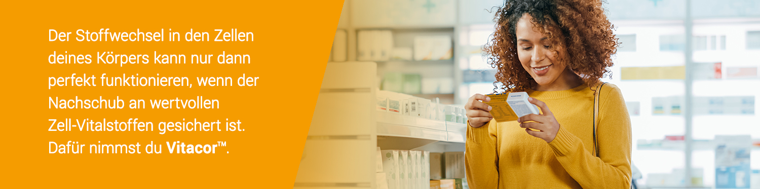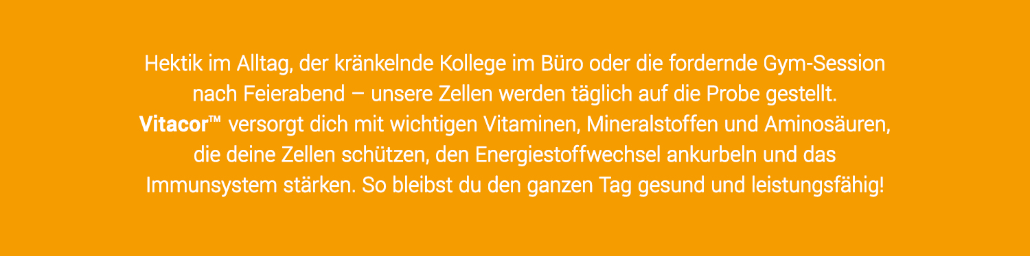 Und genau da sind wir bei Vitacor. Überwacht, zusammengestellt und fachlich begleitet von unseren Wissenschaftlern im Dr. Rath Forschungsinstitut gehören Zell-Vitalstoffe wie Vitamine, Mineralstoffe oder Aminosäuren zu einer grundlegenden Versorgung dazu, denn: